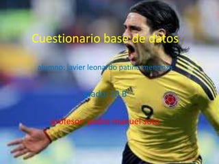 Este documento contiene un cuestionario de 10 preguntas sobre las funciones y características básicas de Access 2010. Las preguntas cubren temas como cómo cerrar una base de datos, las combinaciones de teclas para cerrar el programa, las barras de herramientas y sus funciones, y dónde encontrar opciones como abrir, guardar y obtener ayuda.