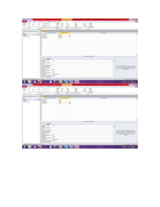 El documento describe los pasos para crear una tabla de clientes en una base de datos de Access, incluyendo darle un nombre a la tabla, definir los campos (nombres, apellidos, teléfono), asignar el tamaño de cada campo, guardar la tabla y llenarla con datos de ejemplo.