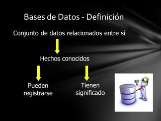 Este documento define una base de datos como un conjunto de datos relacionados entre sí que pueden registrarse y tener significado. Explica las ventajas de las bases de datos sobre los archivos tradicionales, incluyendo la redundancia y inconsistencia controladas, restricciones de seguridad e integridad, y manejo de la concurrencia. También describe los sistemas de gestión de bases de datos y sus funciones de definir, construir y manipular bases de datos para diferentes aplicaciones.