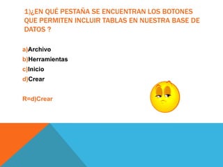 El documento contiene 10 preguntas sobre la creación y edición de tablas en una base de datos. Explica que los botones para incluir tablas se encuentran en la pestaña Crear, la mejor vista para definir la estructura de una tabla es Hoja de datos, al definir un campo se debe especificar como mínimo el tipo de datos y la descripción, y las propiedades de un campo dependerán del tipo de datos elegido. También indica que al definir la clave principal de una tabla se puede poner más de una en la misma tabla y que no es obligatorio definir