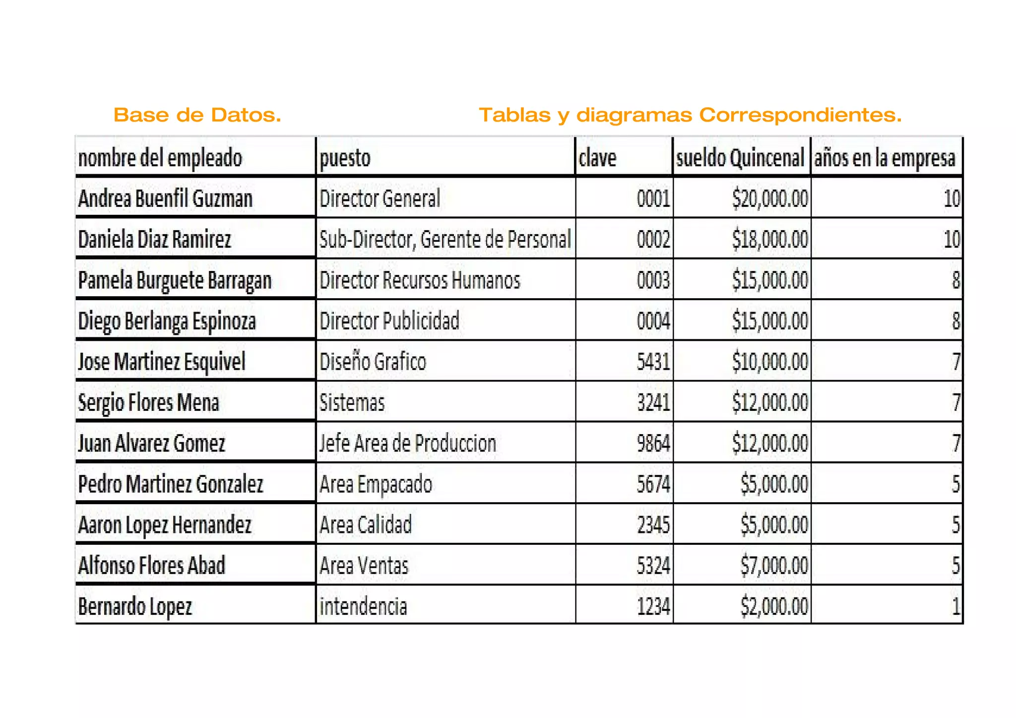 El documento presenta dos diagramas que muestran la relación entre el puesto, años trabajando en la empresa y el sueldo. El primer diagrama muestra que cuanto mayor es el puesto, mayor es el sueldo. El segundo diagrama muestra que entre más años se trabaja en la empresa, mayor será el sueldo.