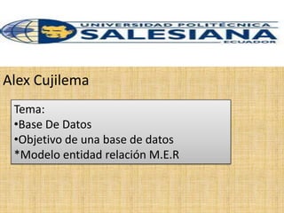 El documento habla sobre las bases de datos. Explica que una base de datos es un conjunto de datos almacenados sistemáticamente para su uso posterior y que existen programas llamados sistemas gestores de bases de datos que permiten almacenar y acceder a los datos de forma estructurada. También describe los objetivos de una base de datos, incluyendo proporcionar una visión abstracta de los datos a los usuarios y ocultar detalles de almacenamiento. Finalmente, introduce el modelo entidad-relación para el diseño de bases de datos.