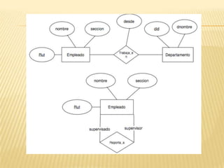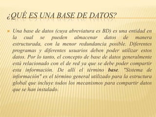 El documento explica que una base de datos es una entidad donde los datos se almacenan de forma estructurada y compartida. Las bases de datos permiten el acceso a los datos a múltiples usuarios de forma concurrente y ofrecen ventajas como la integridad y seguridad de los datos. Los diagramas entidad-relación son herramientas para modelar las entidades, atributos y relaciones relevantes de un sistema de información.