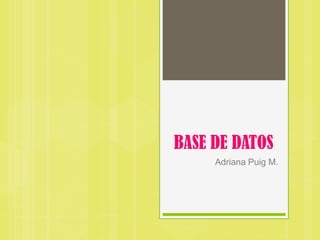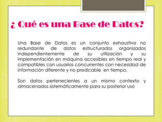 Una base de datos es un conjunto organizado de datos estructurados que pueden ser accedidos en tiempo real por usuarios concurrentes con necesidades de información diferentes. Una base de datos clasifica los datos de acuerdo a su contenido, como bases de datos bibliográficas, de texto completo o directorios. El modelo entidad-relación representa las entidades y relaciones relevantes de un sistema de información a través de diagramas.