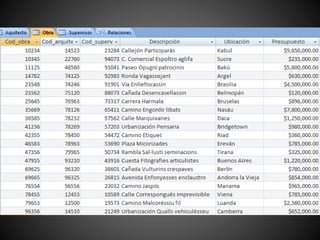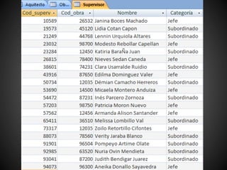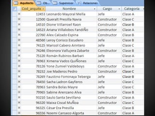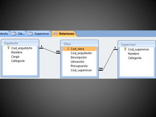 El documento describe un ejercicio que involucra el diseño de una base de datos para un despacho de arquitectura. La base de datos almacenará información sobre arquitectos, obras y supervisores, así como sus relaciones. Se presenta el modelo entidad-relación y la implementación en tablas y relaciones en Access. La reflexión señala que lo más difícil fue lograr la integridad de los datos debido a claves repetidas o erróneas, y evalúa la experiencia como regular por los inconvenientes presentados.