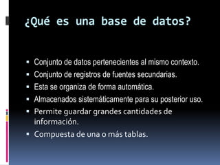 Una base de datos es un conjunto de datos organizados sistemáticamente que permite almacenar grandes cantidades de información de forma estructurada. Una base de datos está compuesta de tablas que contienen registros formados por campos donde se almacena la información. Los sistemas gestores de base de datos permiten almacenar y acceder de forma rápida y estructurada a los datos contenidos en las bases de datos.