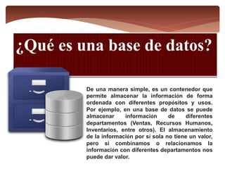 Una base de datos es un contenedor que permite almacenar información de forma ordenada de diferentes departamentos y con diferentes propósitos. El almacenamiento de la información por sí sola no tiene valor, pero cuando se relaciona la información entre los departamentos genera valor. Una base de datos es un almacén que guarda grandes cantidades de información de forma organizada para poder encontrar y usar fácilmente la información.