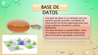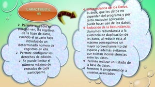 El documento proporciona información sobre un curso de base de datos. Explica que una base de datos es una colección de datos almacenados de forma organizada para su uso posterior. También describe algunas ventajas de las bases de datos como la independencia de los datos y los programas, mayor seguridad y integridad de los datos.