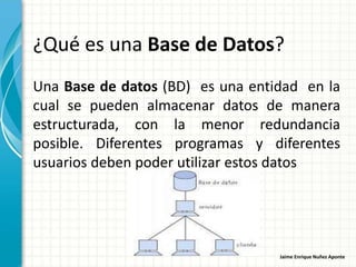 Este documento describe las principales características de las bases de datos SQL y NoSQL. Las bases de datos SQL como SQL Server y Oracle almacenan datos de forma estructurada y admiten transacciones, mientras que las bases de datos NoSQL como MongoDB y Cassandra almacenan datos no estructurados de forma escalable. También proporciona detalles sobre los tipos de datos comunes en SQL y las ventajas de algunas de las bases de datos más populares.