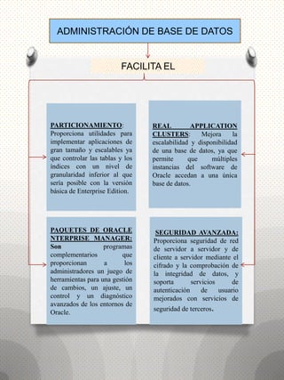 1) Oracle Server es un sistema de gestión de bases de datos que proporciona acceso a la información almacenada en una base de datos Oracle a través de una instancia Oracle. 2) Una instancia Oracle combina procesos en segundo plano y estructuras de memoria para acceder a una única base de datos. 3) La memoria de Oracle se compone del SGA y el PGA, donde el SGA almacena información compartida como la caché de buffers y el conjunto compartido.