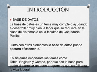 La base de datos es un tema complejo que incluye elementos como tablas, registros, campos y relaciones. El modelo entidad-relación es un modelo conceptual utilizado para el diseño de bases de datos, representando entidades como objetos y relaciones como asociaciones entre entidades. La normalización de bases de datos implica organizar los datos en tablas de acuerdo a las primeras, segunda y tercera formas normales para eliminar redundancias.
