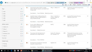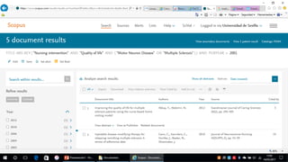 La base de datos Scopus se utiliza para buscar "Nursing intervention" AND "Quality of life" AND ("Motor Neuron Disease" OR "Multiple Sclerosis"). La base de datos Cinahl también se utiliza para buscar información.