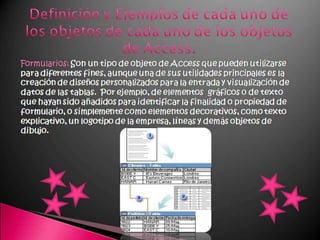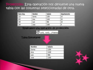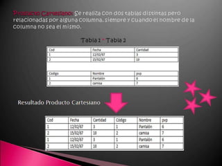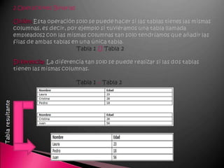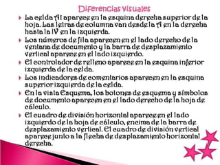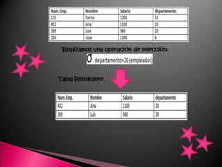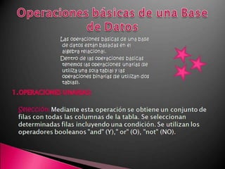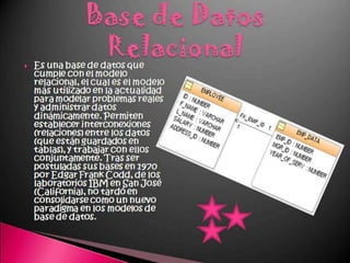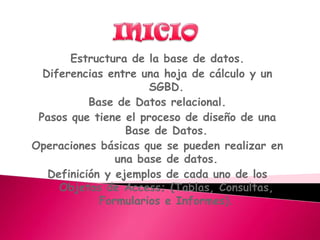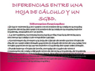 Este documento describe los componentes básicos de una base de datos, incluyendo el hardware, software y datos. Explica las diferencias entre una hoja de cálculo y un sistema de gestión de bases de datos relacionales. También define los tipos de usuarios como usuarios finales, desarrolladores de aplicaciones y administradores de bases de datos.