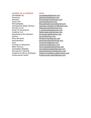 El documento contiene una lista de 20 clientes con sus respectivos nombres, apellidos, empresa, correo electrónico y número de factura. La información incluye datos personales de los clientes y detalles de contacto de sus empresas para realizar seguimiento a las ventas.
