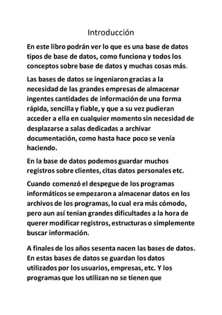 Este documento introduce los conceptos básicos de las bases de datos, incluyendo su historia, tipos y modelos. Explica que las bases de datos se crearon para almacenar grandes cantidades de información de forma rápida y fiable. Describe los modelos jerárquico, de red y relacional, siendo este último el más popular debido a su facilidad de uso.