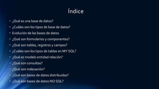 Este documento describe los diferentes tipos de bases de datos. Explica que una base de datos es una colección de información organizada que permite el acceso rápido a los datos. Luego describe los principales tipos como las bases de datos jerárquicas, de red, relacionales y orientadas a objetos. También menciona bases de datos avanzadas como las declarativas.