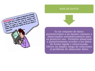 El documento describe las características básicas de una base de datos. La información se organiza en documentos a los que se accede a través de formas y vistas previamente diseñadas. Ofrece ventajas como mayor coherencia, valor y normalización de la información, así como flexibilidad y productividad. Sin embargo, también presenta desventajas como la necesidad de personal especializado y los altos costos de implantación.