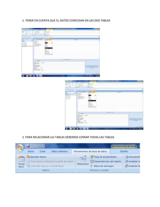 Este documento describe los tipos de bases de datos relacionales y las relaciones entre tablas. Explica que una base de datos relacional permite el uso simultáneo de información de múltiples tablas para evitar duplicidad y aumentar la velocidad. Describe tres tipos de relaciones entre tablas: uno a uno, uno a varios, y varios a varios. Además, proporciona instrucciones sobre cómo relacionar tablas al hacer coincidir datos y arrastrarlos a su parentesco correspondiente.