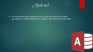 Este documento describe las funciones básicas de Microsoft Access para diseñar y administrar bases de datos simples. Access permite crear tablas relacionadas, consultas utilizando SQL, formularios e informes. Ofrece ventajas como una base de datos relacional fácil de usar, pero tiene limitaciones como solo admitir 16GB por tabla.