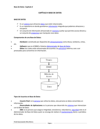 Un documento describe los componentes principales de una base de datos, incluyendo hardware, software, datos, y tipos de usuarios. Explica los niveles de abstracción, conceptos básicos como archivos, registros y campos. También cubre temas como la independencia de datos, integridad de datos, y el rol del administrador de base de datos.
