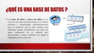 Una base de datos es un conjunto de datos almacenados sistemáticamente para su posterior uso. Actualmente, la mayoría de bases de datos están en formato digital y se almacenan y gestionan mediante sistemas gestores de bases de datos. Un sistema gestor de bases de datos permite definir, almacenar y acceder de forma rápida y estructurada a los datos de una base, garantizando su confidencialidad, calidad y seguridad.