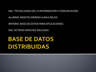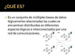 Este documento describe las características principales de un sistema distribuido de bases de datos (SBDD). Un SBDD almacena datos en múltiples computadoras interconectadas a través de una red. Los SBDD permiten el procesamiento autónomo en cada sitio y los usuarios pueden acceder a datos de cualquier lugar de la red como si fueran locales.