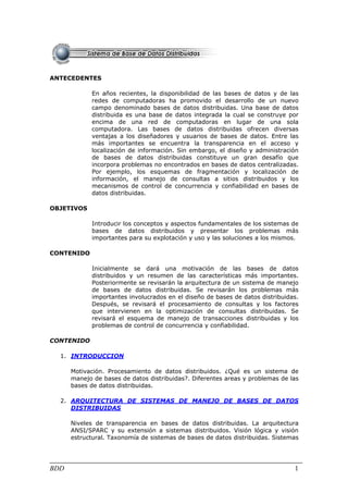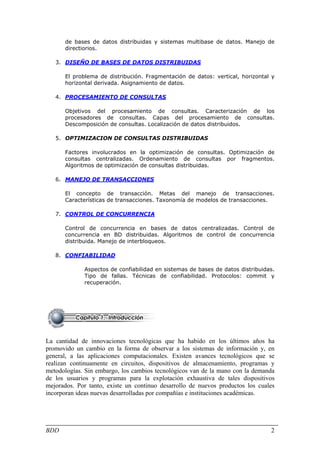 El documento describe los antecedentes y objetivos de los sistemas de bases de datos distribuidas. Explica que la disponibilidad de bases de datos y redes de computadoras ha promovido el desarrollo de este nuevo campo. Aunque ofrecen ventajas como la transparencia en el acceso a la información, su diseño y administración plantean desafíos no encontrados en bases de datos centralizadas. El objetivo es introducir los conceptos y aspectos fundamentales de estos sistemas, así como los problemas más importantes y soluciones relacionadas.