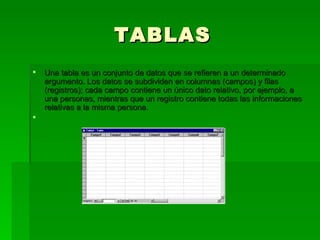 Este documento describe las tablas, consultas y formularios en Access. Las tablas contienen datos organizados en columnas (campos) y filas (registros). Se pueden crear tablas mediante la vista de hoja de datos o diseño. Las consultas permiten recuperar datos de una o más tablas. Se pueden crear consultas sencillas mediante un asistente. Los formularios organizan los datos de forma análoga a fichas y permiten introducir, ver e imprimir datos. Se pueden crear formularios mediante un asistente o el formulario de