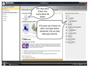 Este documento proporciona instrucciones para crear y configurar los principales componentes de una base de datos de Microsoft Access, incluyendo tablas, formularios, informes y consultas. Explica cómo crear una nueva base de datos o abrir una existente, y luego cómo agregar tablas, campos y registros. También describe cómo personalizar formularios y vistas de informes, y cómo crear consultas básicas y filtros mediante el uso de criterios de búsqueda. Finalmente, resume que las tablas, consultas, formularios e informes son