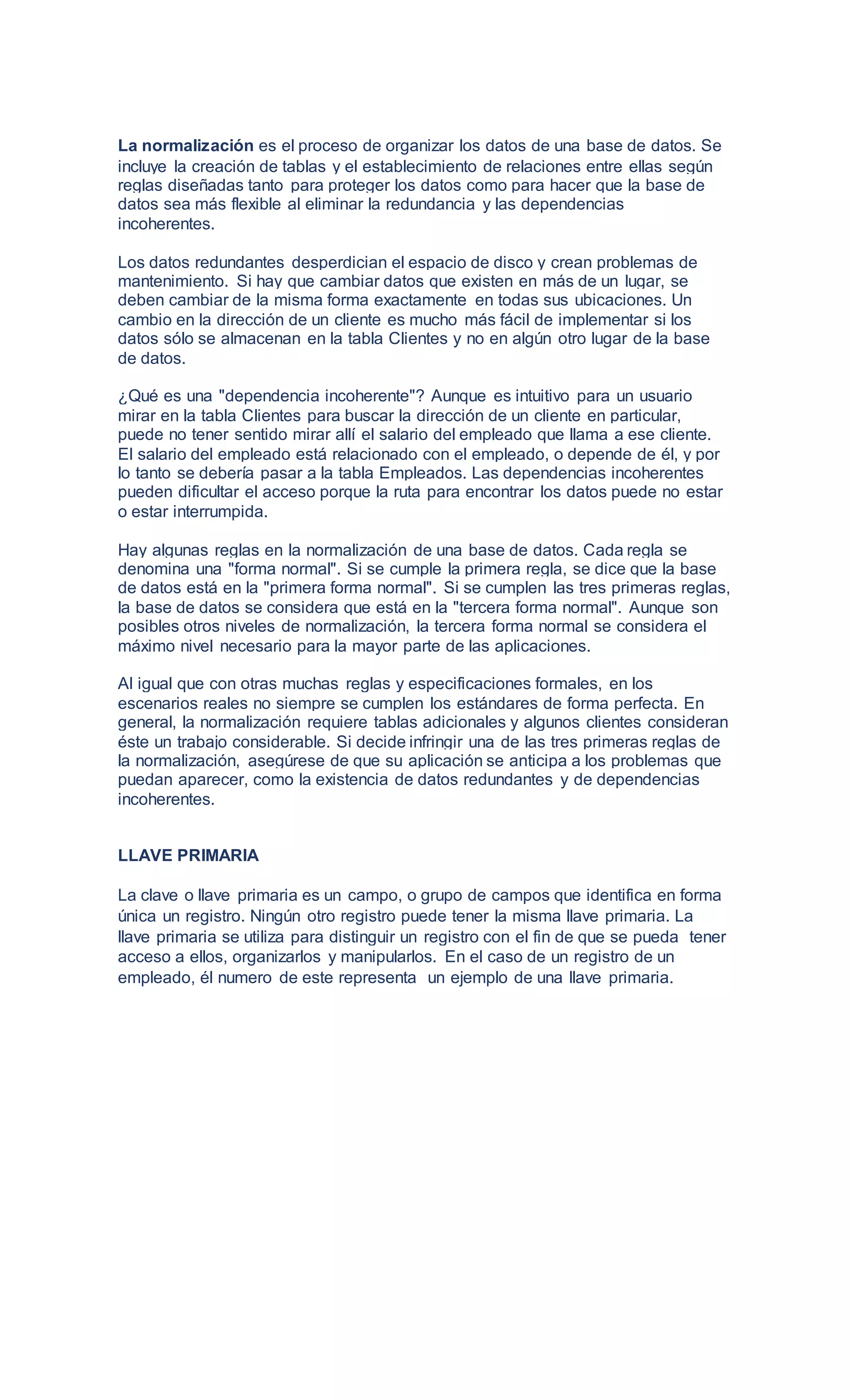 El documento habla sobre la normalización de bases de datos. La normalización es el proceso de organizar los datos eliminando redundancias e inconsistencias mediante la creación de tablas y relaciones entre ellas. Esto hace que la base de datos sea más flexible y proteja mejor los datos al eliminar dependencias incoherentes y datos redundantes.