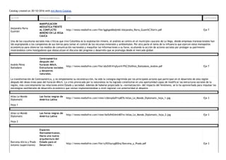 Este documento presenta un catálogo de 16 documentos académicos sobre temas relacionados con América Latina. Incluye información sobre cada documento como el autor, título, URL y categoría temática. Los documentos cubren una variedad de temas como conflictos mineros, desastres naturales, migraciones, pobreza, ciudades latinoamericanas y el papel del estado en el desarrollo agrícola.