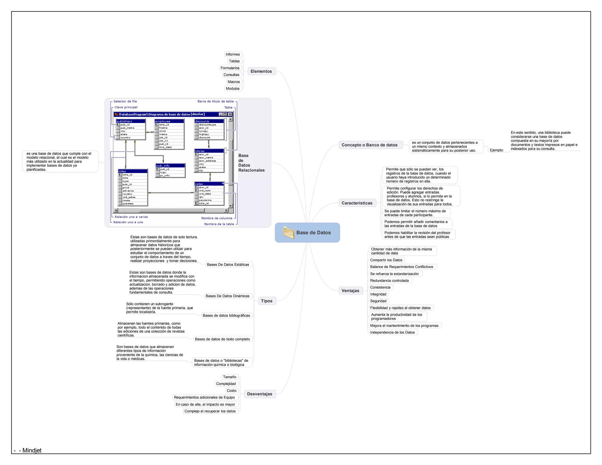 Este documento describe diferentes tipos de bases de datos, incluyendo bases de datos relacionales, estáticas, dinámicas, bibliográficas, de texto completo y de información química o biológica. También discute conceptos como bancos de datos, características y ventajas de bases de datos relacionales.