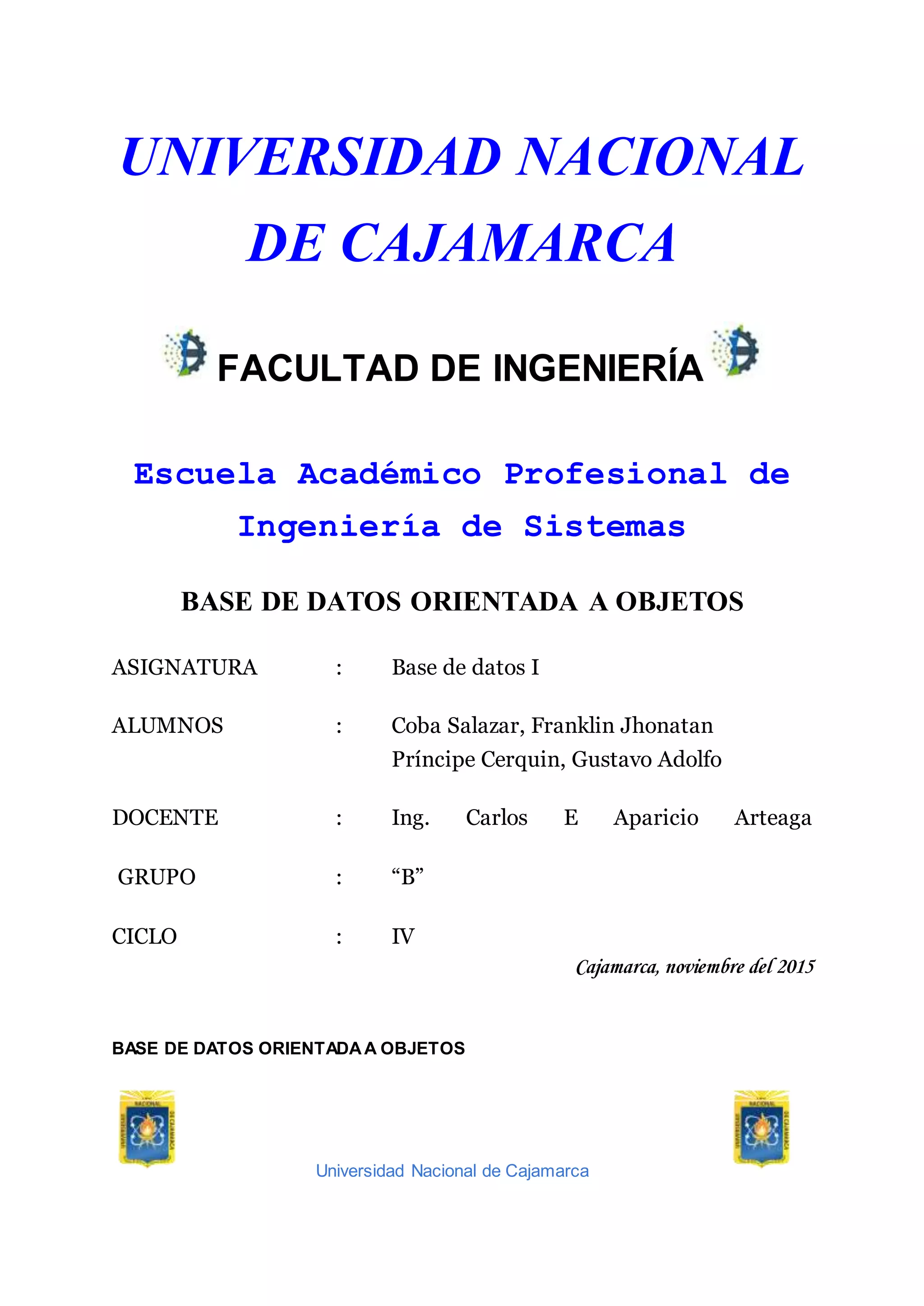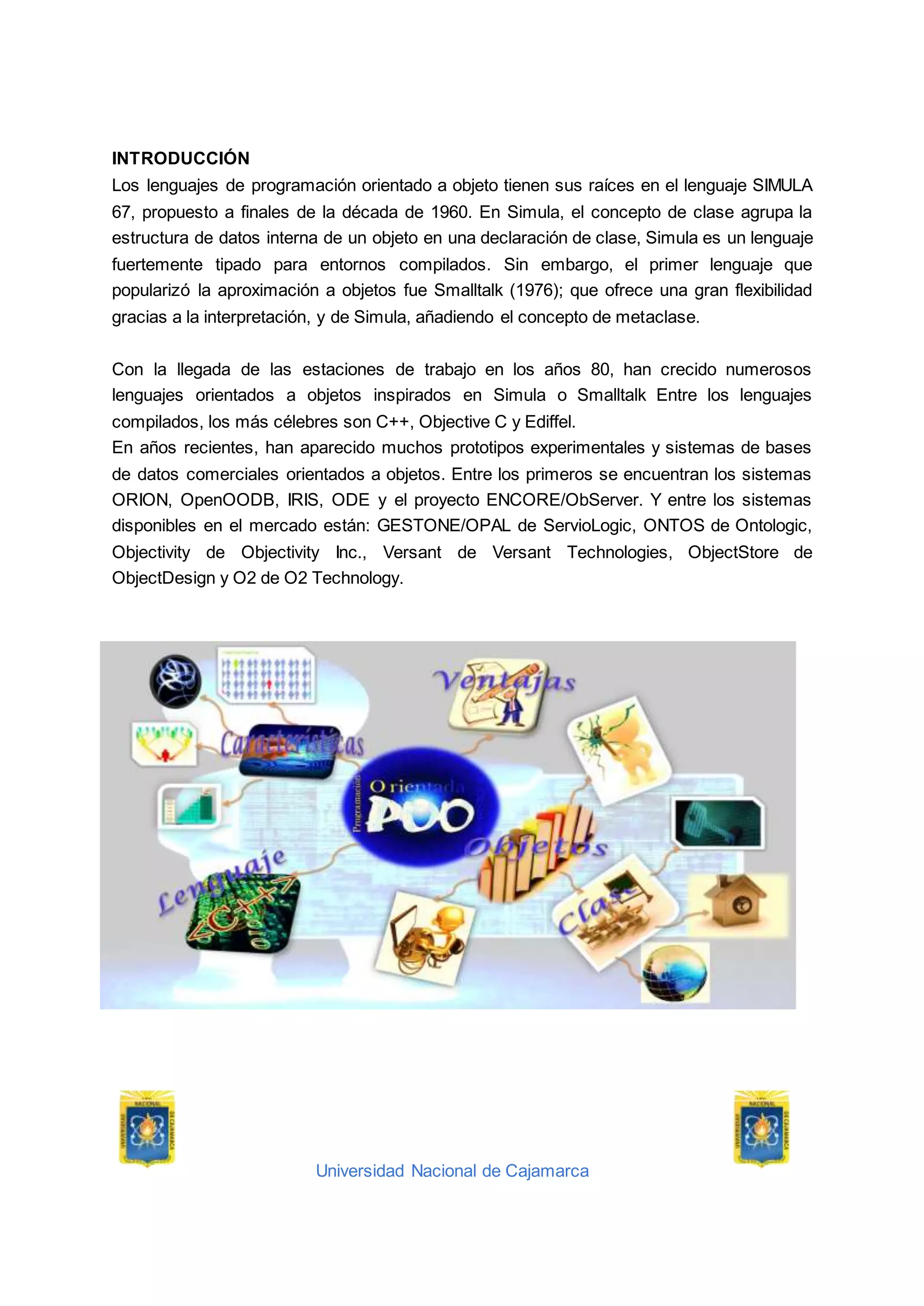 Este documento presenta una introducción a las bases de datos orientadas a objetos. Explica que su origen se debe a las limitaciones de los modelos de datos anteriores para representar cierta información del mundo real. Detalla algunas características clave como el soporte para objetos complejos, identidad de objetos e identificadores únicos. También describe ventajas como una mayor capacidad de modelado y ampliabilidad, así como inconvenientes como la carencia de un modelo de datos universalmente aceptado y de experiencia.