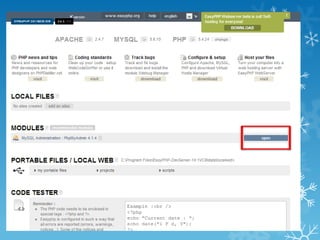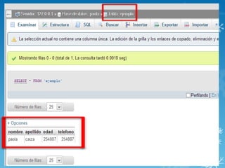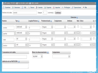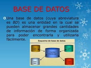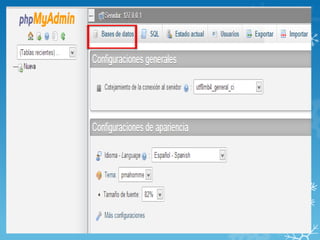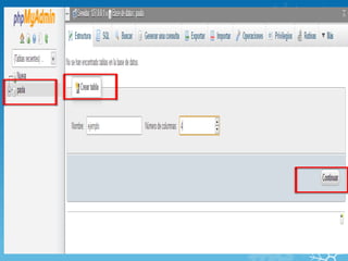 Una base de datos almacena grandes cantidades de información de forma organizada en tablas con columnas y filas. Cada tabla guarda un conjunto de datos estructurados en registros. PhpMyAdmin es una herramienta que permite crear y administrar bases de datos en MySQL a través de comandos como CREATE DATABASE, CREATE TABLE y ALTER TABLE.