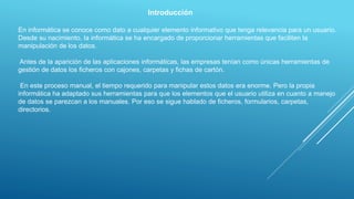El documento presenta una introducción a las bases de datos, describiendo su evolución desde los sistemas de archivos manuales hasta las bases de datos digitales actuales. Explica que una base de datos es un conjunto de datos almacenados sistemáticamente y gestionados por un sistema gestor de bases de datos. Luego describe características comunes de las bases de datos como tablas, registros, campos, claves primarias y claves ajenas. Finalmente, resume los tipos de bases de datos más populares como Oracle, SQL Server, DB2 e IBM.