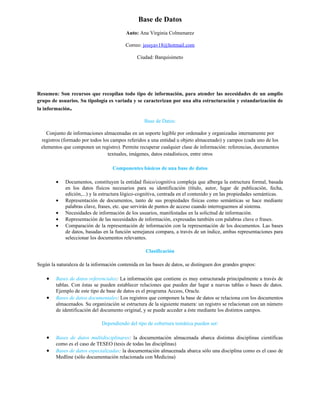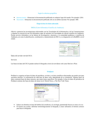Este documento describe varios aspectos de las bases de datos, incluyendo su definición, componentes, clasificación según la naturaleza y cobertura de la información, y ejemplos como ProQuest, WebSPIRS y CINDOC. También ofrece consejos para elegir y realizar búsquedas efectivas en bases de datos.