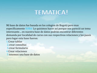 Este documento describe los pasos para crear una base de datos en Access sobre colegios en Bogotá, incluyendo la creación de tablas, consultas, formularios y relaciones. Explica que se enfocaron en la localidad de Suba y que la base de datos contendrá información sobre la demanda de cursos por localidad y sus relaciones. También brinda definiciones breves de base de datos y campo en Access.