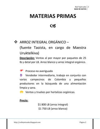 Este documento contiene una base de datos de proveedores de productos orgánicos y artesanales, incluyendo materias primas, hortalizas, productos transformados, cosméticos naturales, productos de aseo y servicios. La base de datos incluye información de contacto de más de 15 proveedores de alimentos y productos como arroz orgánico, miel, nueces de macadamia, aceites vegetales crudos y productos a base de yacón y cacao.