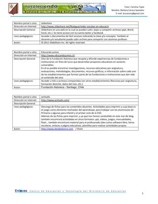 Este documento resume tres portales o sitios web y sus usos pedagógicos. Slideshare permite compartir archivos como presentaciones y documentos. Educando Juntos es un sitio que recopila experiencias educativas de fundaciones. Actiludis ofrece descargas de fichas y actividades para trabajar en el aula conceptos académicos a través del juego.