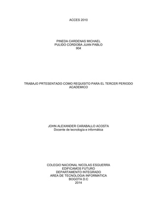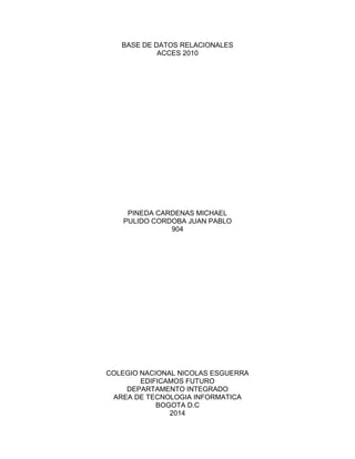 Este documento presenta una introducción a las bases de datos relacionales en Microsoft Access 2010. Explica que una base de datos es una colección de información organizada para un uso específico y gestionada mediante programas. Luego, describe que Access 2010 almacena y maneja la información usando el modelo de base de datos relacional a través de tablas, consultas, formularios e informes. Finalmente, incluye una tabla de contenido con los conceptos básicos que se abordarán.