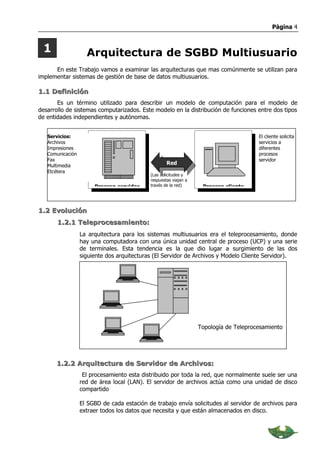 Este documento presenta una introducción a las arquitecturas de sistemas de gestión de bases de datos multiusuario. Explica la evolución desde la arquitectura de teleprocesamiento hasta las arquitecturas cliente-servidor de dos y tres niveles. También describe los componentes clave de las arquitecturas cliente-servidor, incluyendo clientes, servidores, middleware de comunicaciones y de base de datos. Finalmente, introduce conceptos como monitores de procesamiento de transacciones y protocolos de red.