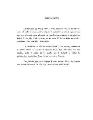 El documento describe un diccionario de datos creado por estudiantes para una base de datos de una terminal de autobuses. El diccionario de datos permite organizar y definir de forma precisa todos los datos del sistema para que analistas y usuarios los entiendan. Incluye el nombre, descripción, alias, contenido y organización de los datos, así como la identificación de procesos y accesos a la información. El diccionario también puede localizar errores y facilitar el análisis del sistema.