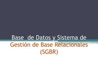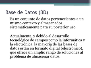 Este documento describe las características de una base de datos y de un sistema de gestión de base de datos relacional (SGBR). Una base de datos es un conjunto de datos almacenados sistemáticamente para su uso futuro, y generalmente se almacenan en formato digital. Un SGBR es un software que permite a las personas y empresas almacenar, modificar y extraer información de una base de datos de manera independiente de los programas. Las bases de datos tradicionales se organizan por campos, registros y archivos, y ofrecen seguridad, independencia de