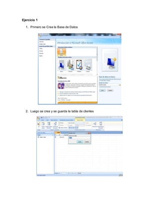 Este documento presenta tres ejercicios sobre el uso de bases de datos. El primer ejercicio describe cómo crear una tabla de clientes y definir los campos y sus propiedades. El segundo ejercicio explica cómo crear tablas adicionales, definir campos, establecer claves primarias y relacionar tablas. El tercer ejercicio es similar al segundo pero incluye la creación de campos de búsqueda para buscar clientes.
