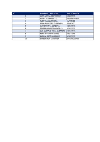 El documento lista 10 personas que participaron en un evento y sus roles, incluyendo 2 organizadores, 1 ponente, 5 asistentes e 2 invitados.