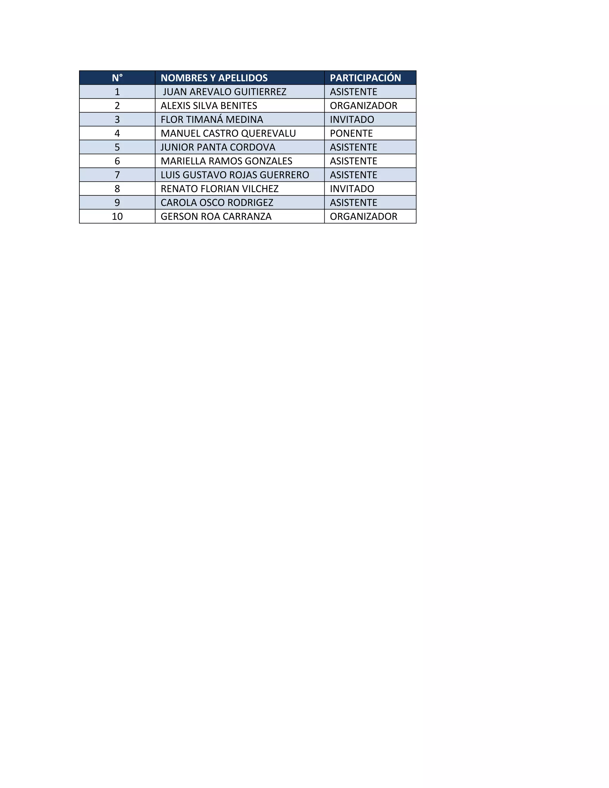 El documento lista 10 personas que participaron en un evento y especifica sus roles, incluyendo a 2 organizadores, 1 ponente, e invitados y asistentes.