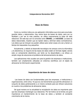 Una base de datos es una colección de datos organizada que permite almacenar y relacionar grandes cantidades de información de manera estructurada. Las bases de datos son fundamentales para empresas e instituciones ya que permiten almacenar y compartir datos de manera eficiente. Un administrador de base de datos es responsable de implementar, mantener y gestionar las bases de datos de una organización para garantizar la seguridad, disponibilidad y rendimiento de la información.