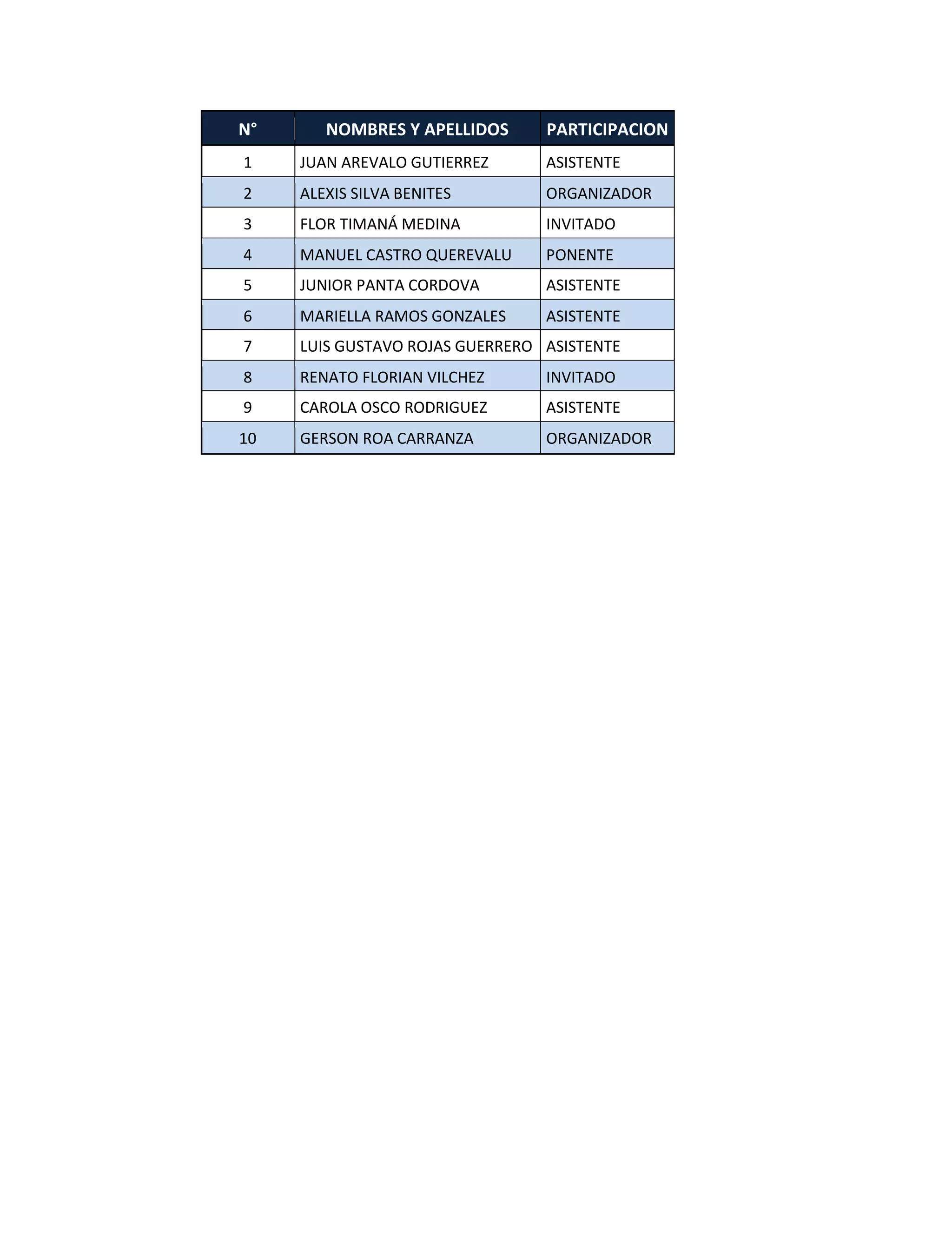 El documento lista 10 personas que participaron en un evento y especifica sus roles, incluyendo a 2 organizadores, 1 ponente, e invitados y asistentes.