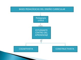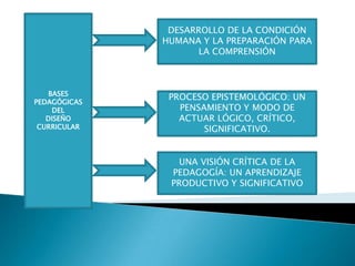 Este documento describe las bases pedagógicas del diseño curricular. Se fundamenta en un modelo pedagógico crítico que pone al estudiante en el centro del aprendizaje. Este enfoque busca desarrollar el pensamiento lógico, crítico y creativo del estudiante, así como un aprendizaje productivo y significativo a través de diversas metodologías cognitivas y constructivistas.