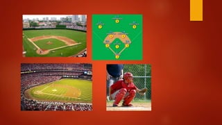 Este documento resume las características principales del béisbol, incluyendo su popularidad en países de América y Asia, los equipos de 9 jugadores, el campo de juego con bases en las esquinas de un diamante, y los beneficios del deporte para la salud como el desarrollo muscular y cardiovascular.